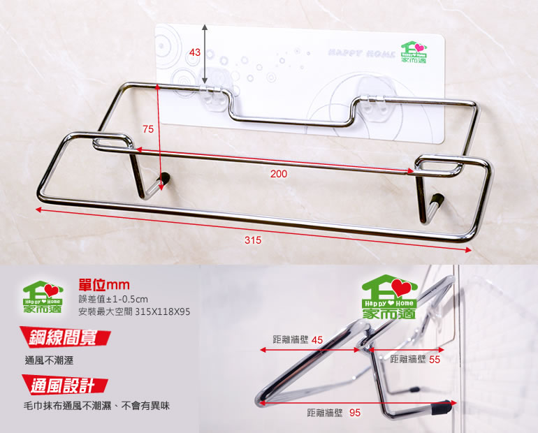 1.全新強黏性設計安裝後可馬上使用,建議放置一小時再使用承重更強2.強力貼膠片多次黏貼後效能會逐次降低,建議使用前慎選安裝位置