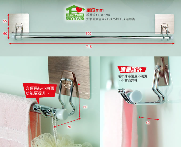 精緻極簡設計,組裝簡單免工具,髮絲紋不鏽鋼掛架100%不生鏽,長70cm非一般市售60cm產品,易乾不發黴,雙邊勾型設計方便吊掛小東西。
