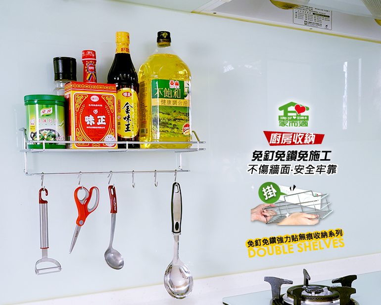 超大置物空間,廚房2公升大瓶食用油都放的下, 浴室2000CC沐浴清潔用品也沒問題。 附6支不鏽鋼活動小掛勾,下支架可掛毛巾抹布收納多又廣。
